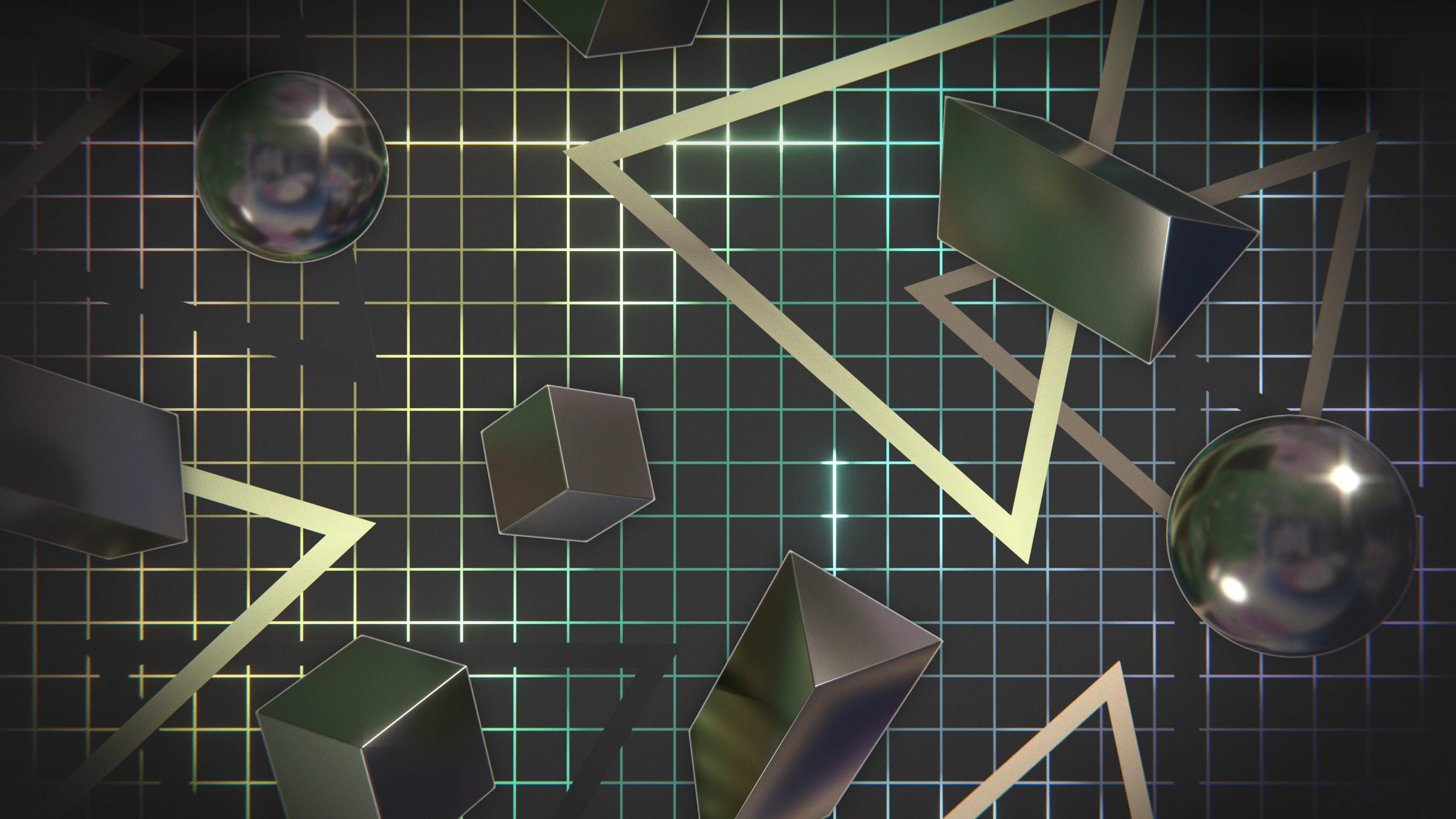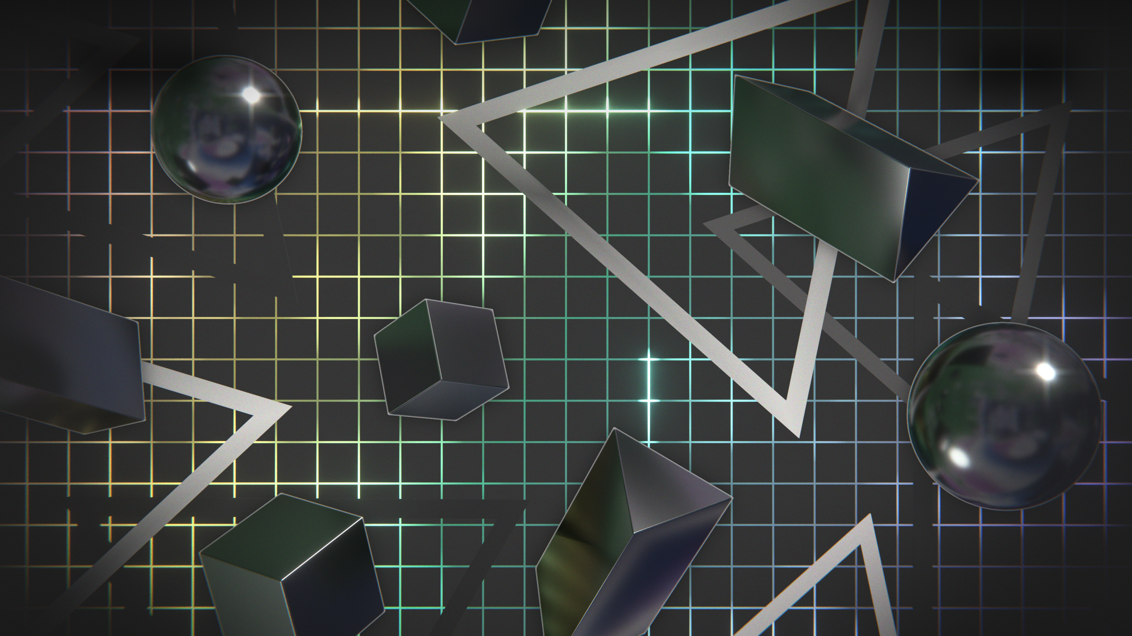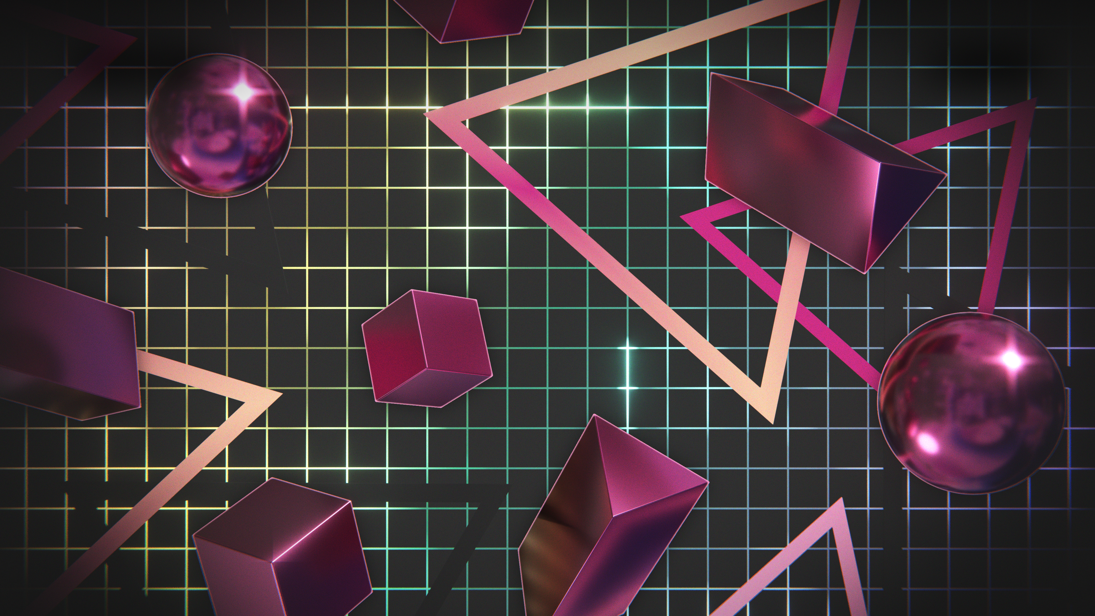 A wallpaper design inspired by retro graphics from the 80's and 90's, featuring chrome shapes floating over a colorful grid.