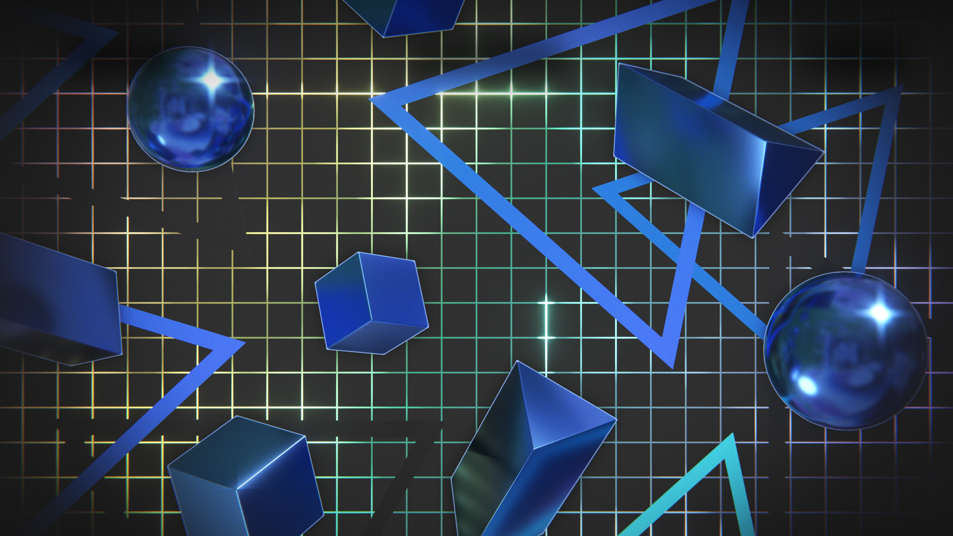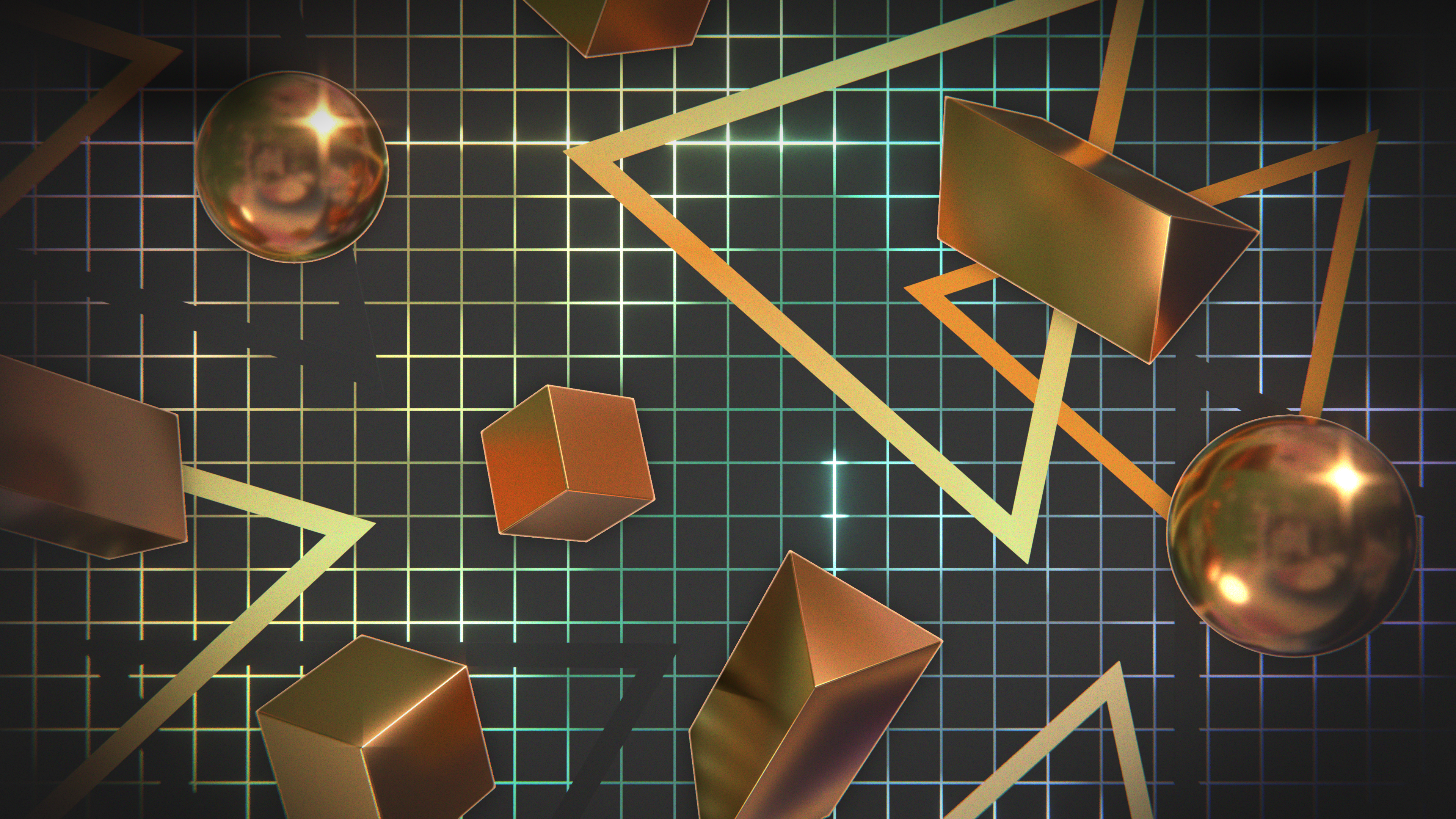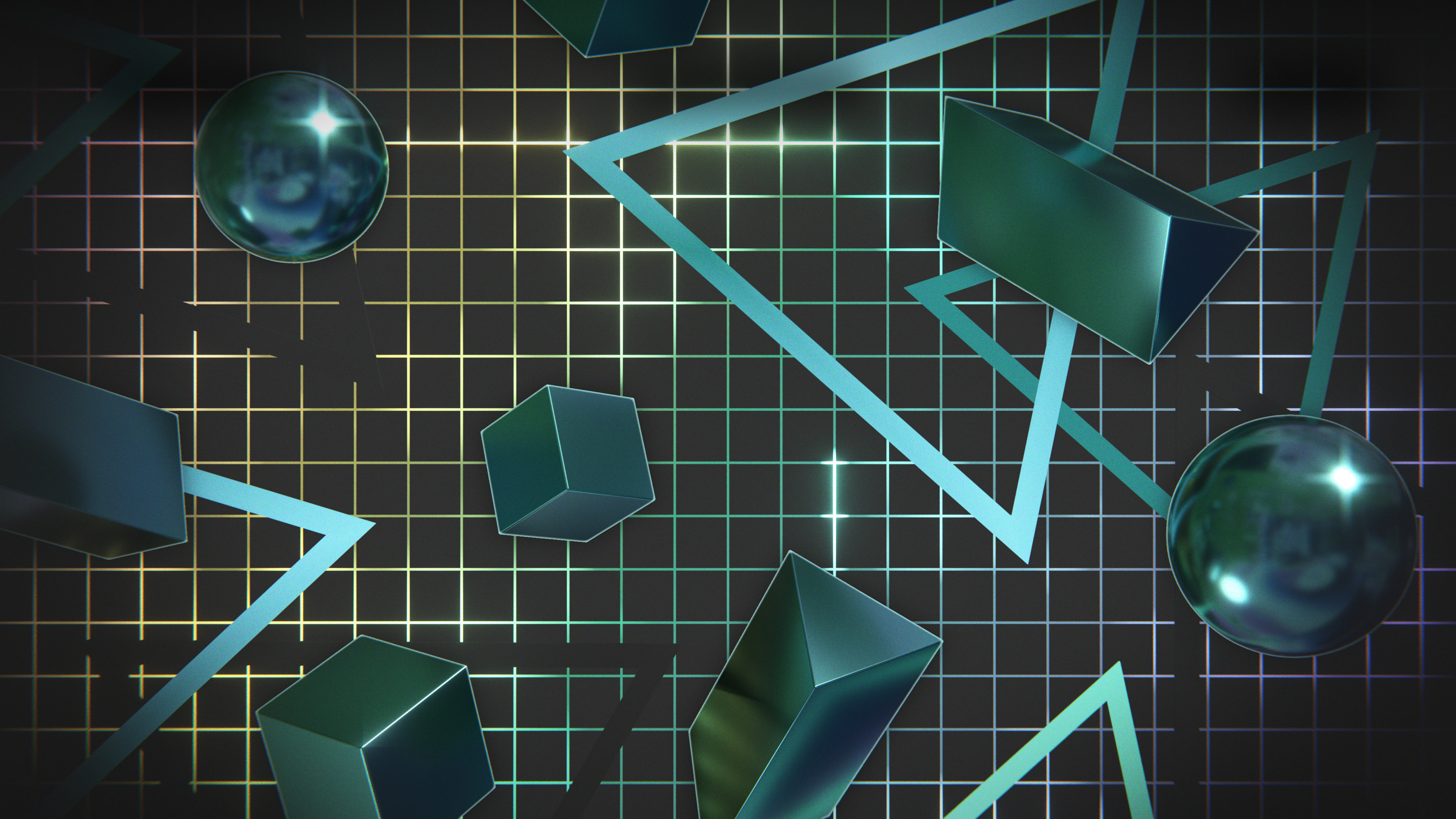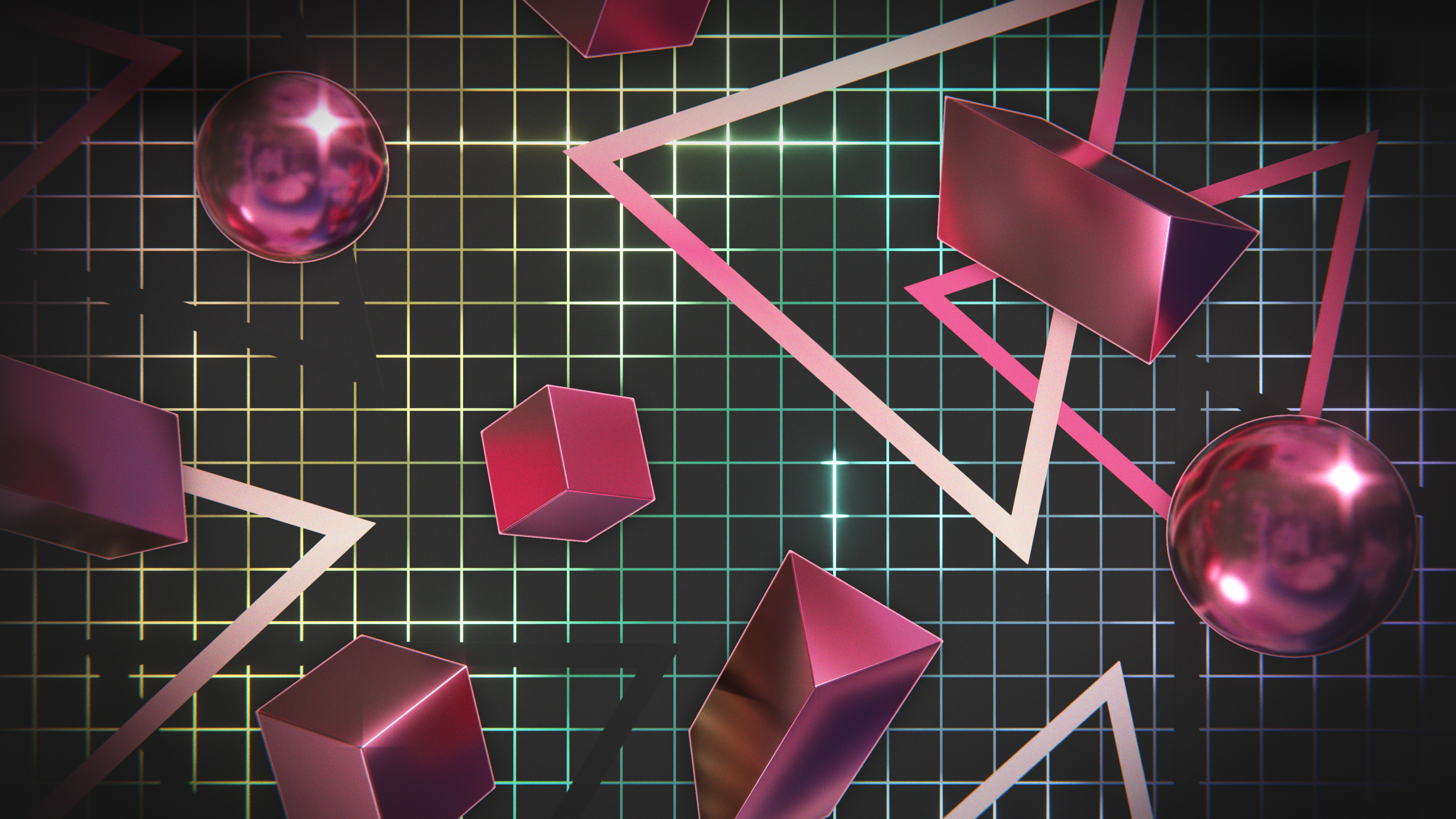 A wallpaper design inspired by retro graphics from the 80's and 90's, featuring chrome shapes floating over a colorful grid.